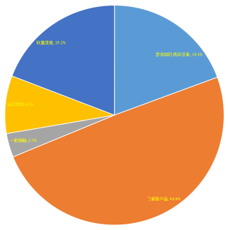 在来的参观观众中,了解行业新产品的观众占了49.4%,参观购买设备占19.4%,洽谈项目占8.5%,在展会上来接触相关企业及产品的占3.5%。