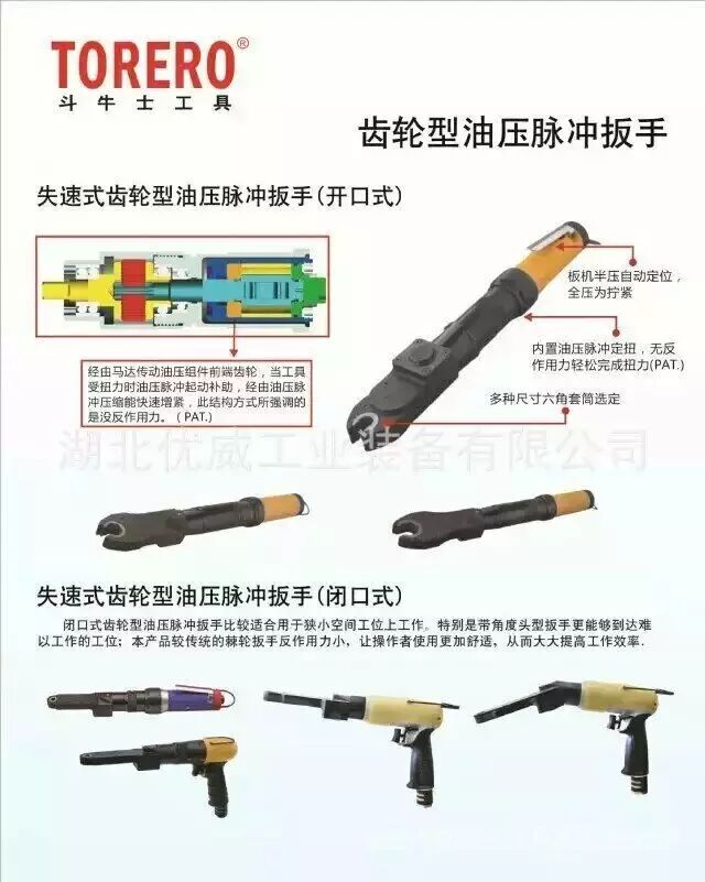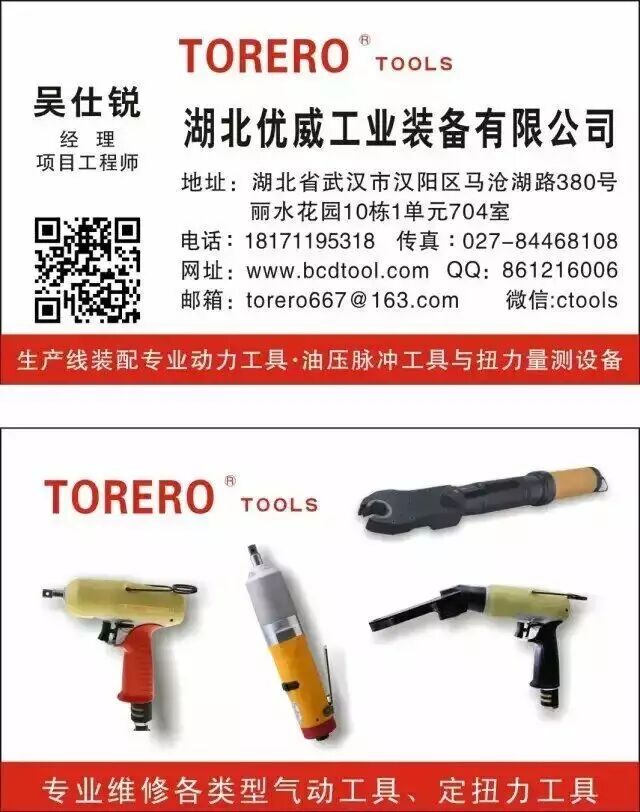 湖北优威工业装备有限公司负责台湾TORERO斗牛士华中区及西南区市场的产品推广和售后服务,是一家经营高品质扭矩检测设备、气动工具、气动套筒、油压脉冲工具、液压工具、扭力扳手、电动伺服工具、电动工具、手动工具、机电设备、磨具磨料及工具耗材等产品的有限公司。另代理:台湾冠亿KI 工具、加拿大GENIUS 天赋工具、台湾AIR BOSS亚柏士工具、美国巨霸PUMA工具等。