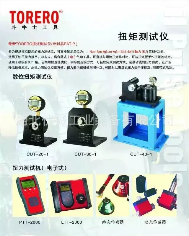 台湾TORERO(斗牛士工具)专业从事气动工具研发、生产、销售;在气动工具制造领域始终处于领先地位。主要生产油压脉冲定扭工具、离合式工具、冲击工具、扭矩量测设备。目前TORERO品牌已成为专业拧紧工具的供货品牌,并成为国内外汽车组装厂、专业生产线的首选。