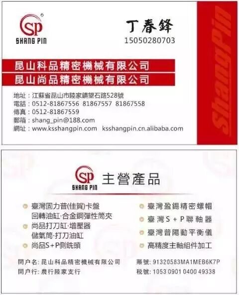 昆山尚品精密机械有限公司:主营台湾固力普(佳贺)卡盘,台湾固力普(佳贺)油缸标准产品,台湾盈锡精密螺帽,台湾普阳动平衡仪,台湾弘旺动力侧铣头,日本NSK恩斯克轴承,尚品打刀缸,尚品增压器,尚品储气筒,台湾丸荣四瓣爪,台湾S+P联轴器等产品。