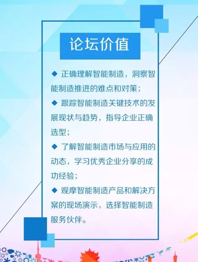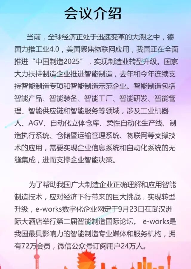 号称国际智能制造领域的“达沃斯论坛”——2016中国智能制造国际论坛将于9月23日,在武汉国博的洲际大酒店举办。大会以“未来十年中国智能制造路线图”为主题,由李培根院士担任大会主席,中国科学院院士丁汉教授等国内外智能制造大师发表主题演讲,5家智能制造代表企业进行经验分享,400位规模以上工业企业CEO和CIO负责人参会,预计现场观众达1000人。会议的举办将为行业企业提供一个与工业企业近距离交流,了解企业需求,获得合作机会,聆听国家智能制造发展战略,把握工业发展脉搏技术交流平台,促进行业发展。