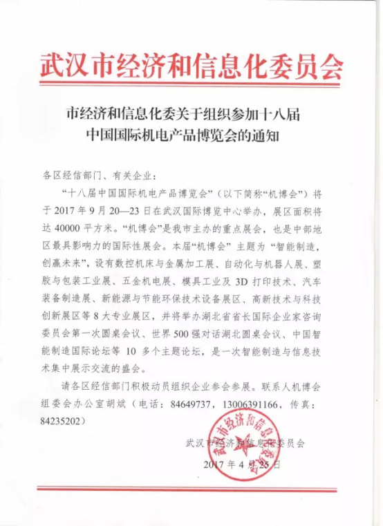 由国家商务部、中国国际贸易促进委员会、湖北省人民政府、武汉市人民政府主办,重庆市立嘉会议展览有限公司承办的第十八届中国国际机电产品博览会(简称“机博会”)将于2017年9月20-23日在武汉国际博览中心举办。