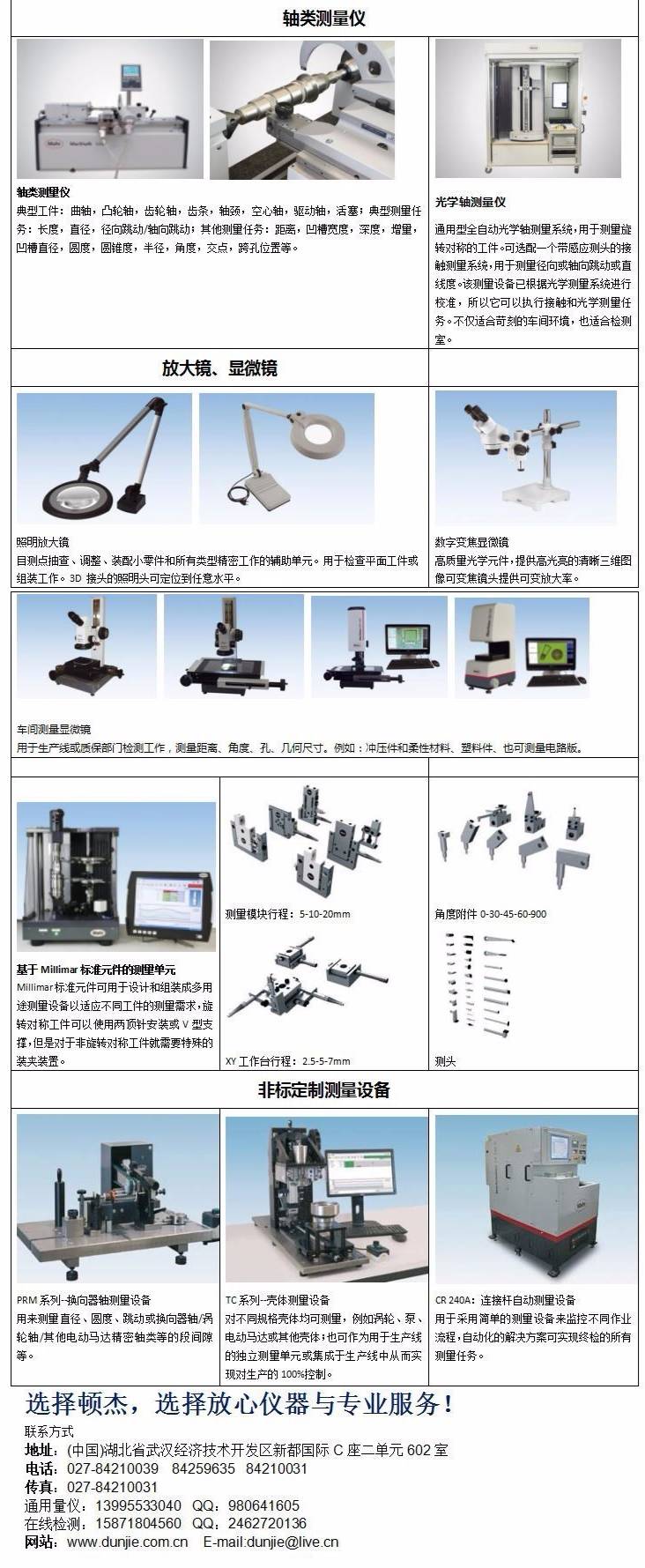 武汉顿杰测量仪器有限公司成立于2009年,是湖北武汉一家从事工业检测仪器领域的专业公司。主要代理德国马尔公司几何类精密量仪产品,涵盖通用基础量具、气动量仪、量块仪表检定仪、环规比较仪、测高仪,轮廓、粗糙度、圆柱度测量仪,测厚仪,测径仪,影像仪。同时我们还设计制造非标计量检测产品、特制工装、夹具及在线几何尺寸测量系统,综合检测系统等。公司自成立以来,建立了完善的网络渠道,服务全国各中小型企业及经销商,拥有大批优质客户资源,已经成功进入钢材制造、汽车制造、五金配件制造、电子制造等各大行业。